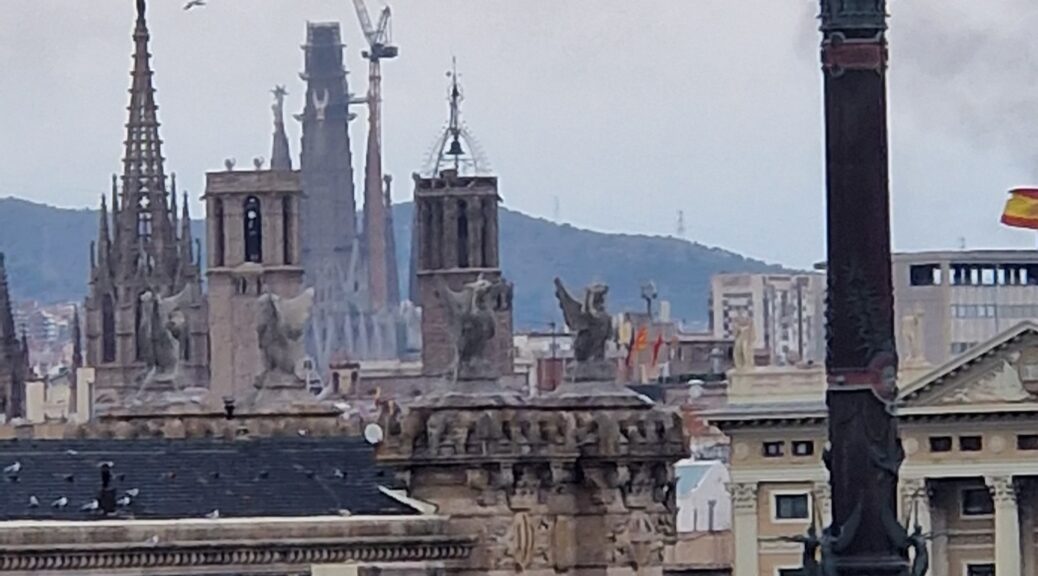 Barcelona und weitere Fährfahrt Ich habe gut geschlafen auf dem Schiff. In der Nacht fuhren wir entlang der Cote Azur an die Spanische Ostküste. Wir kommen gefen 12 Uhr am Sonntag zum Zwischenhalt der Fähre nach Barcelona. Die Fähre ist pünktlich da. Uns bietet sich vom Meer ein eindrucksvolles Panorama der Stadt.