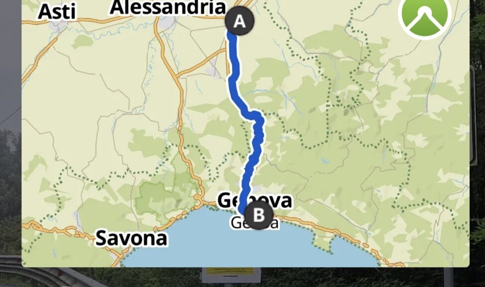 Übers Gebirge nach Genua Es ist wohl das Appenin Gebirge das sich vor dem Mittelmeer aufürmt und heute überfahren wurde. jedenfalls bin ich gut in Genua angekommen.  Auch deshalb weil ich dem Navigator nicht gefolgt bin. Da kam ich nach einer halben Stunde in eine Wildnis mit Single-Trail, jedenfalls kein Weg für mein voll beladenen Reiserad. Ich fuhr dann meist an der Landstraße 35 entlang über das Gebirge. Am schwierigsten war es dann am Ende im Genueser Stadtverkehr. Im Hotel…