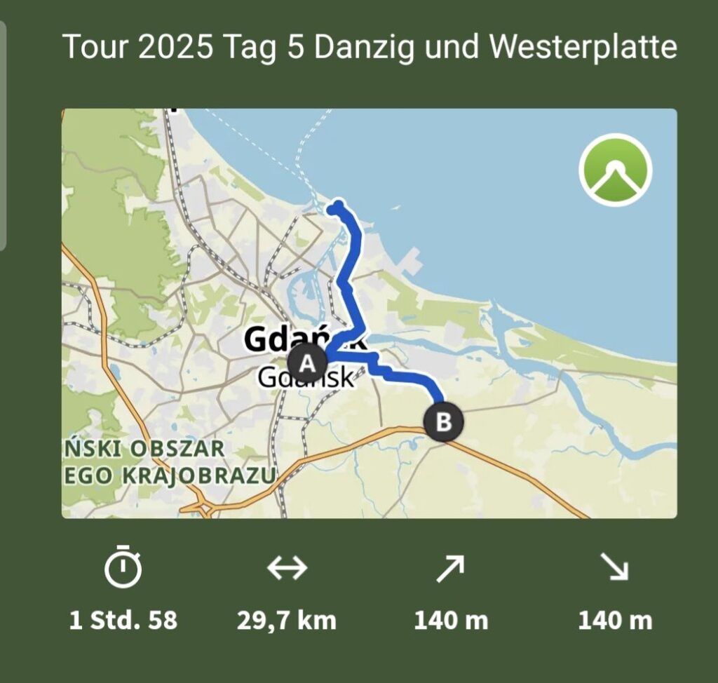 Die nächsten Tage werden sehr anstrengend ich werde erst in Bialystock wieder einen Pausentag haben. Das sind sechs oder sieben Etappen. Knapp 800 km durch Masuren. Da ich die Qualität der Wege nicht abschätzen kann vermute ich, dass ich kürzere Tages Etappen fahren muss.