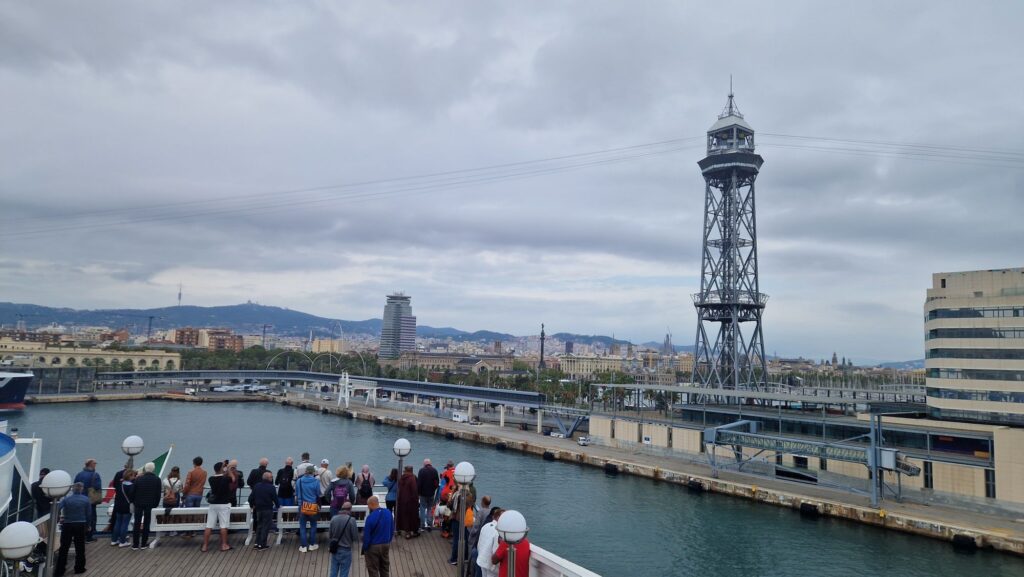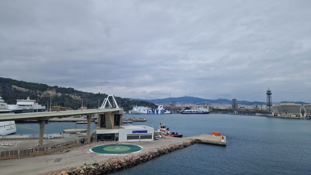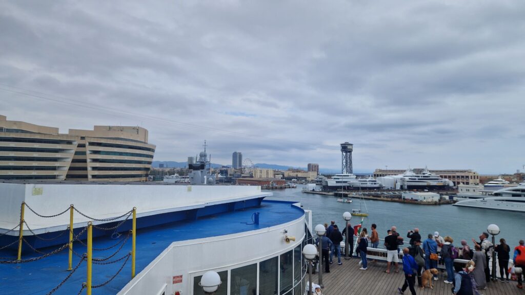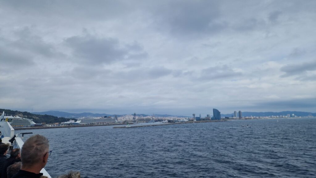 Wir kommen gefen 12 Uhr am Sonntag zum Zwischenhalt der Fähre nach Barcelona. Die Fähre ist pünktlich da.
