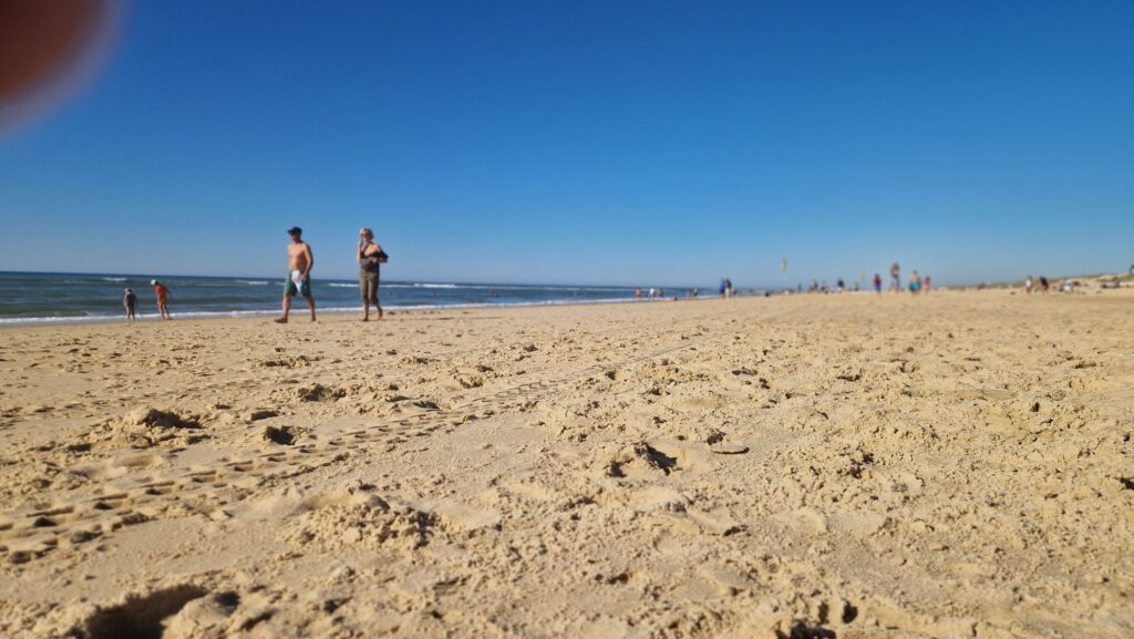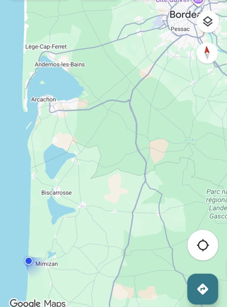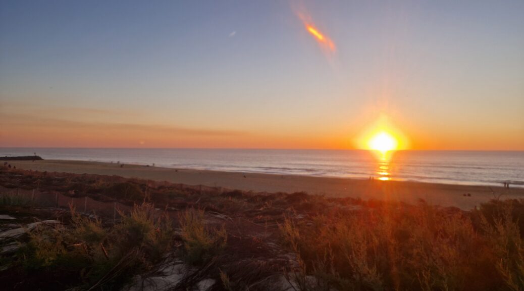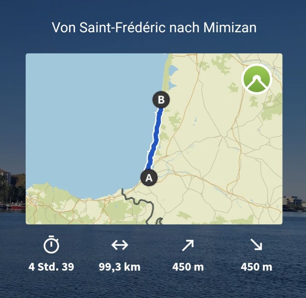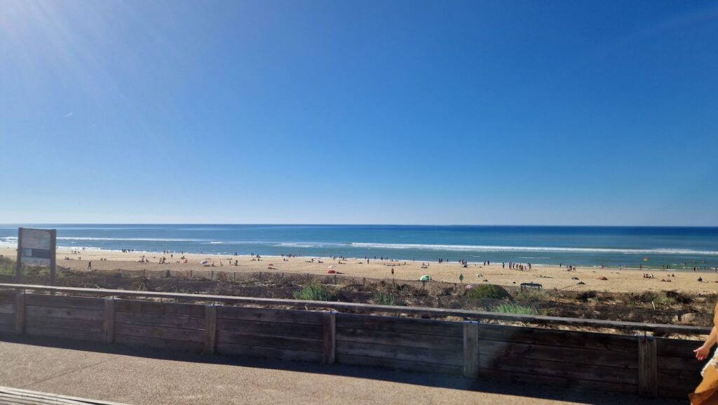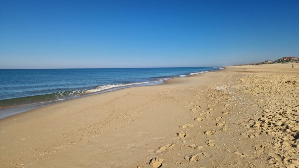 Heute früh bin ich in Bayonne gestartet und am Nachmittag gegen 15 Uhr in Mimizan gelandet. Ein Badeort mit Strand, so weit man schauen kann. Das Hotel ist prima und nur 100m vom Strand entfernt. Hab mich auch gleich in den Atlantik gestürzt. Der hat eine Temperatur um 19 bis 20 Grad. Die Franzosen nennen die Küste hier „Cote d’argent“ – Goldküste.